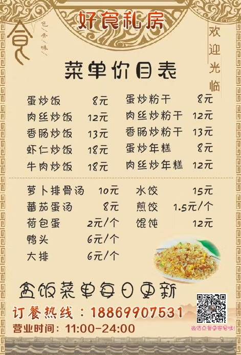 提供:快餐、炒饭、炒年糕、饺子、馄饨、快餐菜每天变化不能确定,炒饭可以蛋炒饭、肉丝、香肠、牛肉、青菜。