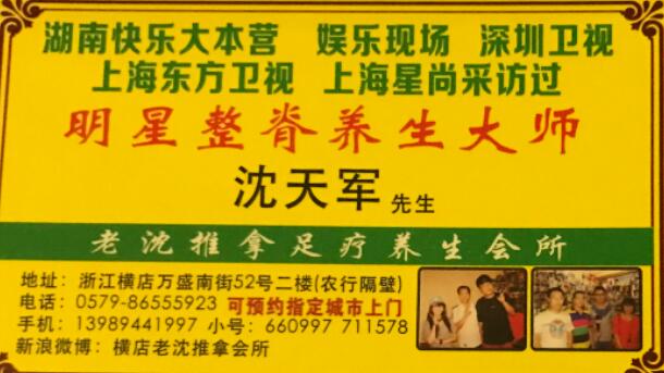 老沈盲人推拿主料中心位于东阳市横店镇万盛街52号二楼(农行隔壁),现有员工10名,主要经营项目有:推拿、按摩、足疗、拔罐、刮痧、减肥等,技术娴熟,信誉良好,价格实惠而且手法到位,很多明星都会光顾被誉为明星横店必经之地,欢迎广大新老顾客光临惠顾。