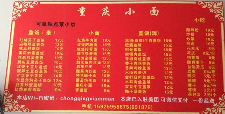 特色:凉皮、重庆小面、酸辣粉、盖浇饭、小炒。