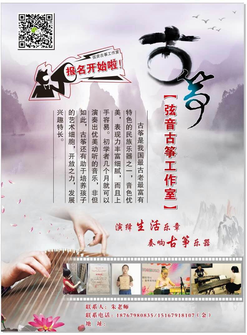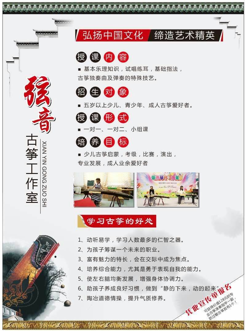 古筝又名汉筝、秦筝、瑶筝、鸾筝,是中国民族传统乐器中的筝乐器,属于弹拨乐器。它是中国独特的、重要的民族乐器之一。它的音色优美,音域宽广、演奏技巧丰富,具有相当强的表现力,因此它深受广大人民群众的喜爱。现在也出现了小古筝、便携式古筝、迷你古筝、半筝、新筝、十二平均律转调筝。古筝是一件伴随中国悠久文化,在这肥沃的黄土地上土生土长的古老民族乐器。属弹拨乐器,结构由面板、雁柱(一些地段也称之为筝码)、琴弦、前岳山、弦钉、调音盒、琴足、后岳山、侧板、出音口、底板、穿弦孔组成。