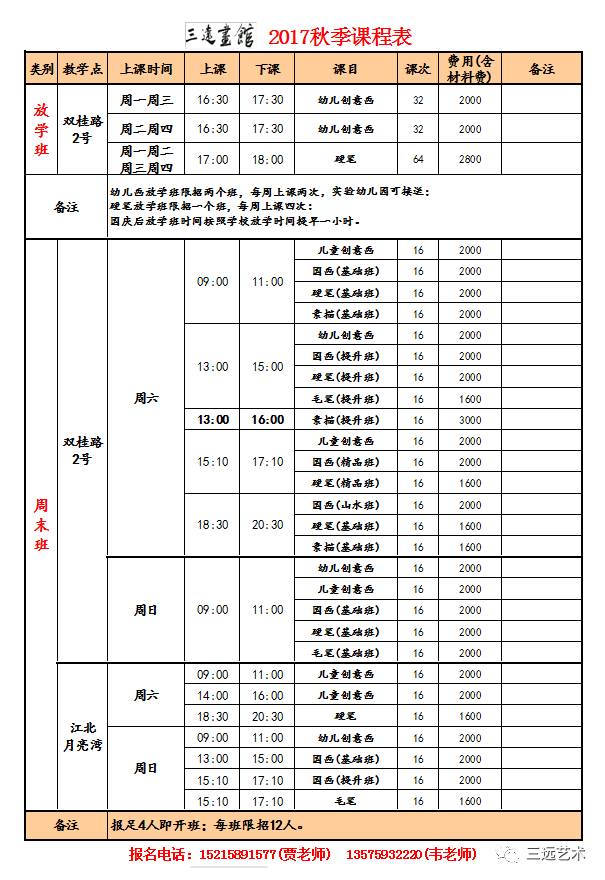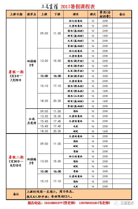 三远画馆常年招收学龄学员、成人书画爱好者,开设了幼儿创意画、儿童创意画、国画、素描、硬笔书法、软笔书法、成人书画等众多课程。画馆旨在传承优秀传统艺术,尊重个性发展,启发创新思维,坚持实施小班化教学,因材施教,精心培育。以教学质量为核心,以培养兴趣、快乐学习为动力,坚持走“精品化教学”为目的。