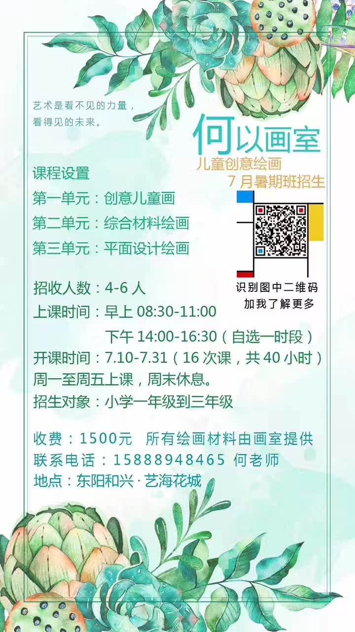 开设:创意儿童画、综合材料绘画、平面设计绘画。对象:小学一年级到三年级。